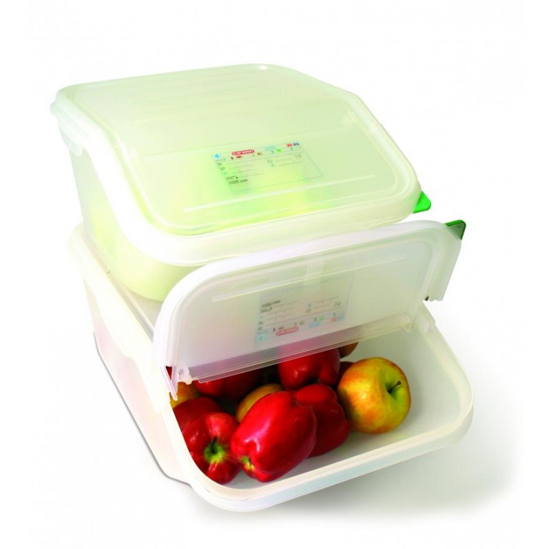 Contenedor accesible. Dimensiones: 395x200x200 mm. Capacidad: 7 litros Color : Semitransparente . Material: Polietileno . Cumplimiento de todas las normativas europeas. Araven cumple con todas las normativas de migraciones. Permite lavado en el lavajillas. Temp. Max.: +90ºC. Temp.Min.: -40ºC.