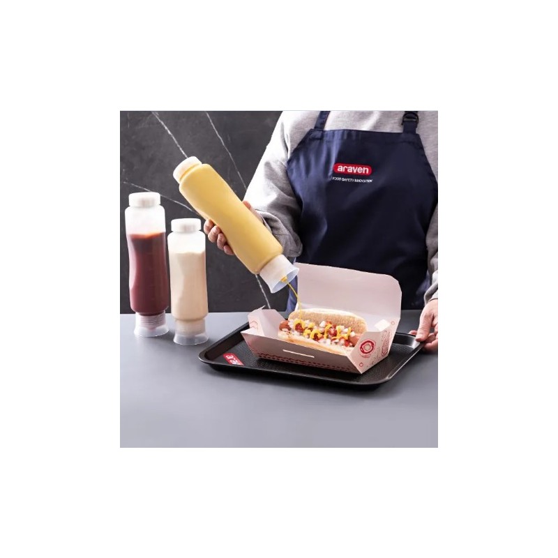 El dosificador FIFO FAST Araven 45 cl. es una solución para dispensar, de forma rápida, condimentos y salsas como mayonesa, mostaza o kétchup. Esenciales en Fast Food, Food trucks, Dark Kitchen y Take away.