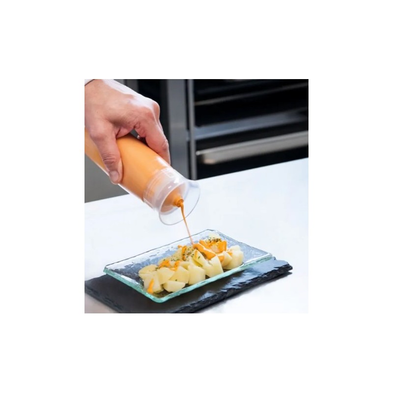 El dosificador se coloca boca abajo permite una dosificación más rápida y sencilla, al acumularse la salsa en la zona inferior del bote, próxima a la válvula. La válvula dosificadora se abre cuando se ejerce presión en el bote. También se comporta a modo de junta en el tramo de ajuste de cierre. FIFO. Facilita la adecuada rotación de las salsas. Su amplia boca de entrada facilita el llenado con solo quitar el tapón posterior. Fácil limpieza: Desmontable y con total accesibilidad al interior del bote para una correcta limpieza en el lavavajillas. Forma ergonómica que se adapta a la palma de la mano, aporta una mayor comodidad de agarre.