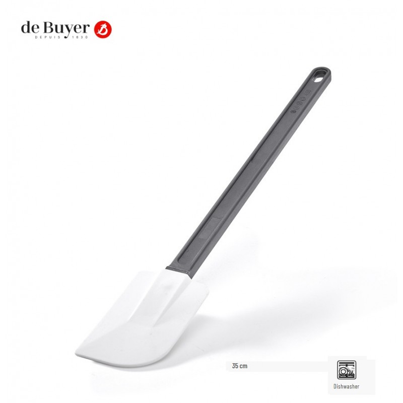 Espatula. Materiales: silicona y nylon. Tipo lengua. Resistente a altas temperaturas (+260ºC). Longitud: 35 cm. La espátula flexible "Maryse" tiene una hoja de silicona resistente al calor que la hace perfecta para trabajos en caliente (temperatura máxima de funcionamiento: +260°C).