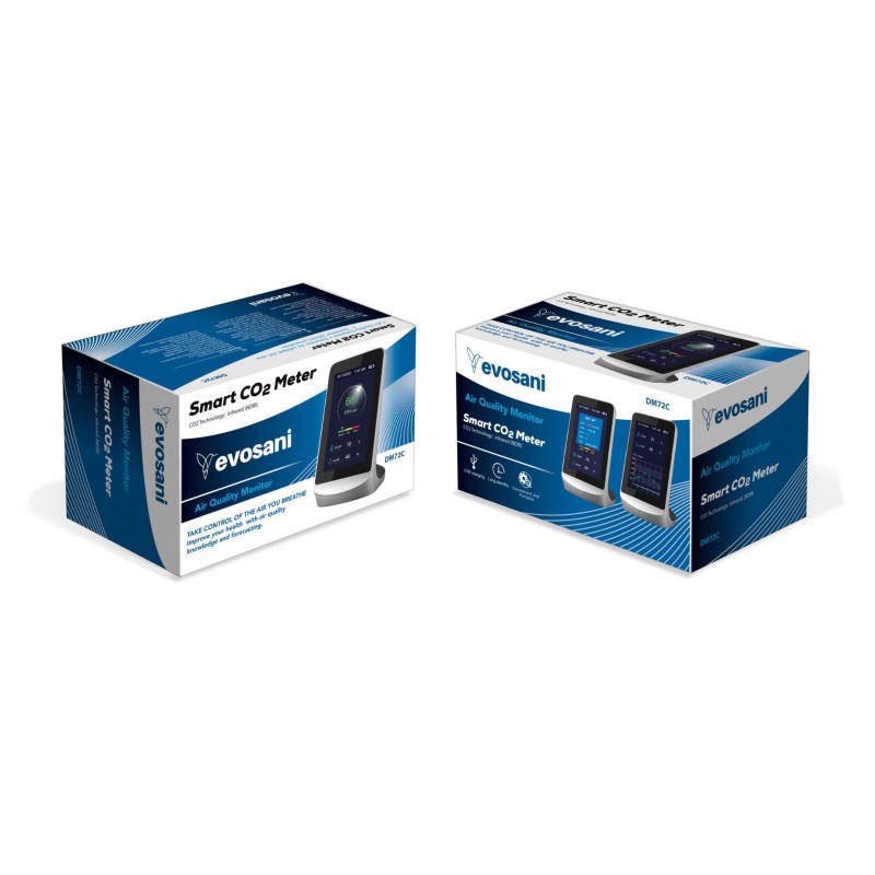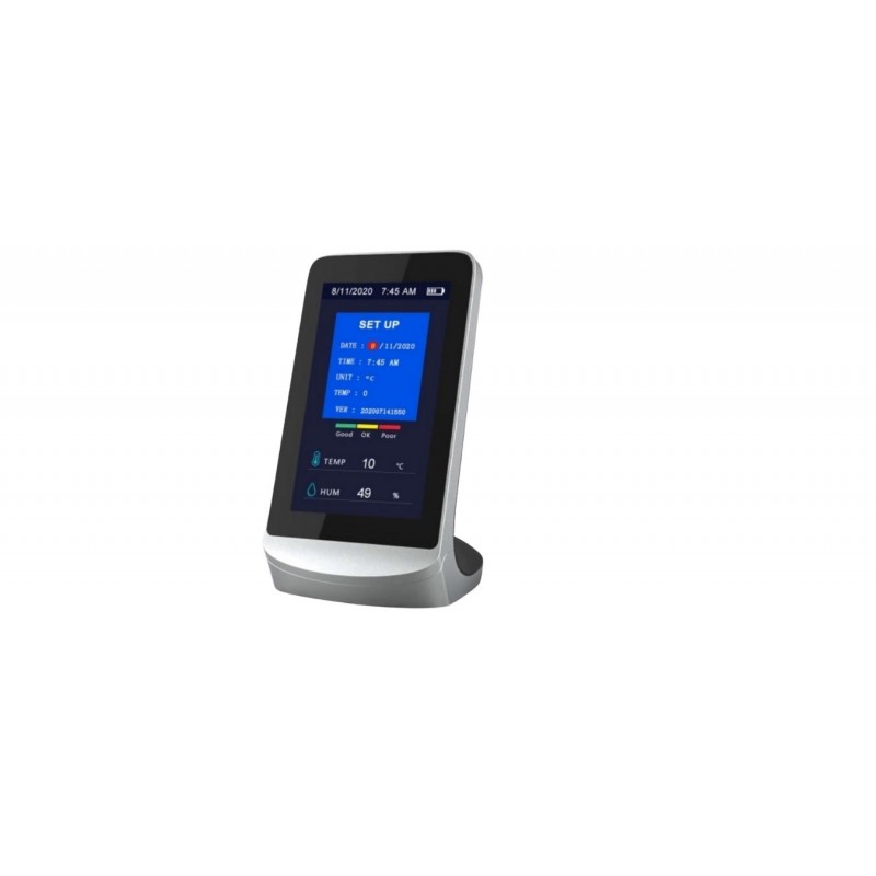 Medidor de CO2. Detector de calidad del aire multifuncional que detecta CO2 (dióxido de carbono), temperatura y humedad con función de reloj y registro. Como dispositivo científico de detección de la calidad del aire, combina un sensor de infrarrojos (NDIR) con un ventilador incorporado para permitir el monitoreo en tiempo real de CO2 (dióxido de carbono), temperatura y humedad en su pantalla LCD digital. Pantalla de cristal líquido (LCD) a color de 4,3 , 320×240 píxeles, monitorización en tiempo real las 24 horas. Elementos de medición: CO2, temperatura, humedad. Batería de litio de gran capacidad de 3000 mAh. Ventilador integrado para aspirar aire ambiental para obtener resultados más precisos en tiempo real. Carga Micro USB de 5V y advertencia de batería baja. Rango deteccion CO2 400-5000ppm. Dimensiones 14.5x9,7x7.8cm , Temperatura de deteccion -10ºC a 50ºC, precision humedad relativa +/-4% Hr. Peso 0.225kg