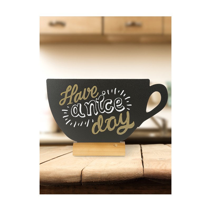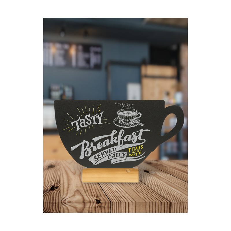Caballete de sobremesa. Dim: 22x33cm.Material: Resina de melamina. Material base: Madera. Forma: Taza. Pizarras de Madera para Mesa Formas recortadas con precisión en una superficie de escritura de doble cara, fuerte pero flexible, con una base de madera dura.
