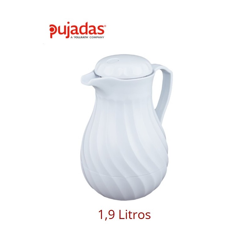 Termo Hot N Cold Blanco de Pujadas está fabricado en policarbonato. Esta material tiene un acabado que simula a la cerámica. Es perfecto para mantener la temperatura en bebidas frías y calientes. Color blanco. Está diseñada con líneas que dibujan remolinos y dan a la jarra un aspecto clásico. Tiene un pulsador para facilitar el uso de la jarra. Capacidad: 1900 ml.