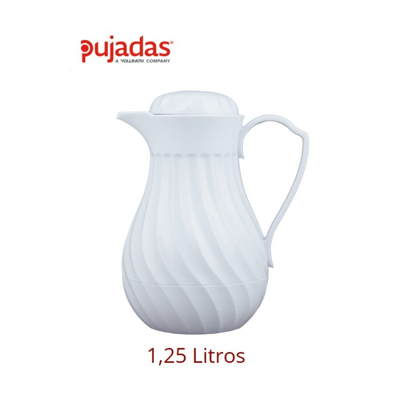 Termo Hot N Cold Blanco de Pujadas está fabricado en policarbonato. Esta material tiene un acabado que simula a la cerámica. Es perfecto para mantener la temperatura en bebidas frías y calientes. Color blanco. Está diseñada con líneas que dibujan remolinos y dan a la jarra un aspecto clásico. Tiene un pulsador para facilitar el uso de la jarra. Capacidad: 1242 ml.