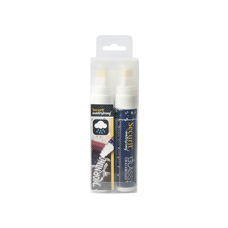 Formato: Blister 2 unidades rotulador tiza. Color: Blanco. Trazo:7-15 mm Rotulador para Cristal y Pizarra a Prueba de Agua. Resistente al agua, no se corre ni descolora en cualquier superficie. Escribe en todas las superficies no porosas y se limpia facilmente con una esponja y el limpiador.