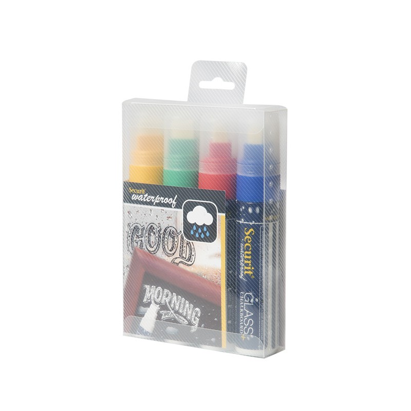 Formato: Blister 4 unidades rotulador tiza. Colores: Azul, rojo, verde y amarilloBlanco. Trazo:7-15 mm Rotulador para Cristal y Pizarra a Prueba de Agua. Resistente al agua, no se corre ni descolora en cualquier superficie. Escribe en todas las superficies no porosas y se limpia facilmente con una esponja y el limpiador.